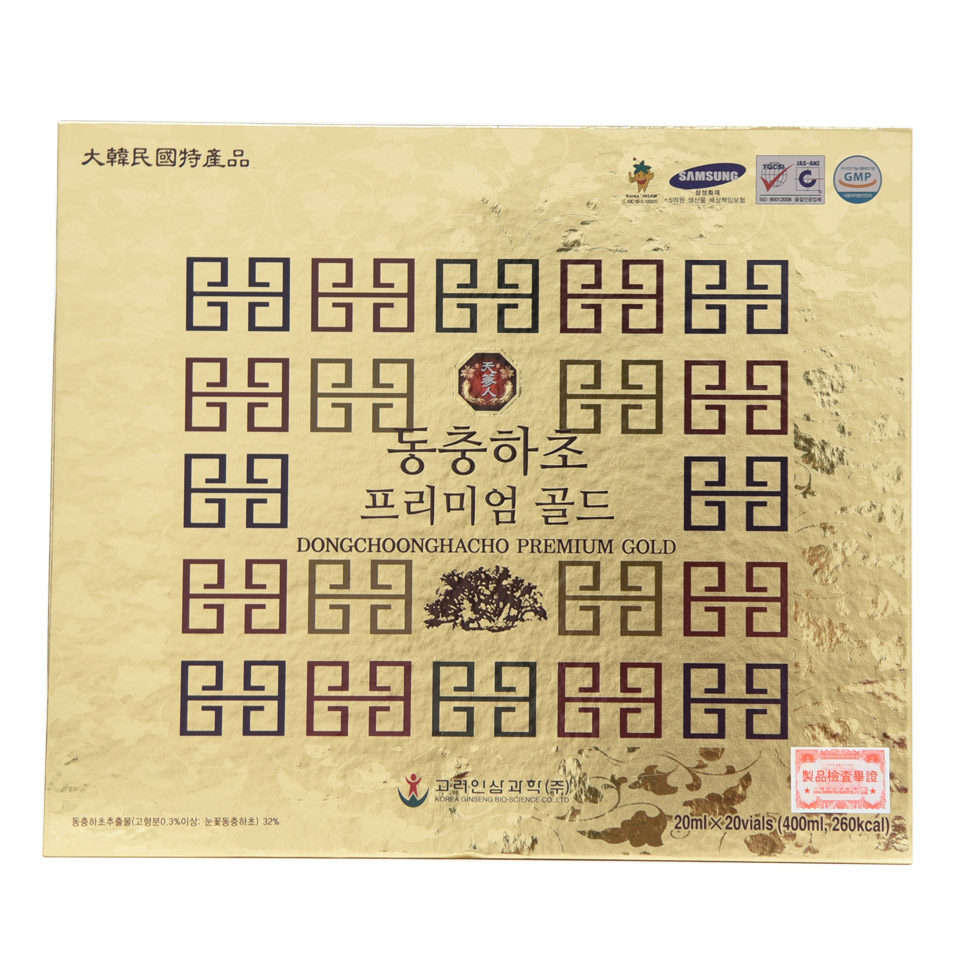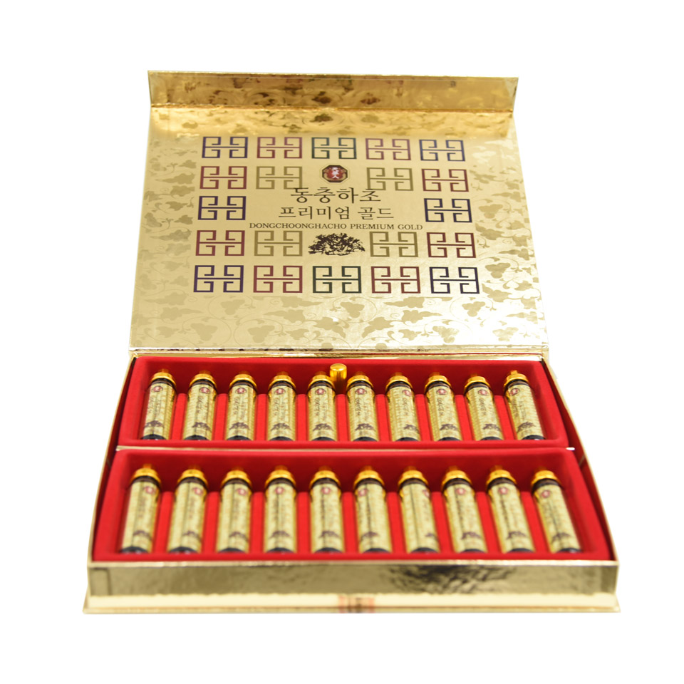 Quy cách: Hộp Dongchoonghacho Premium Gold gồm 20 ống thủy tinh 20ml, nắp cao su mở ống bằng cách bẻ nắp