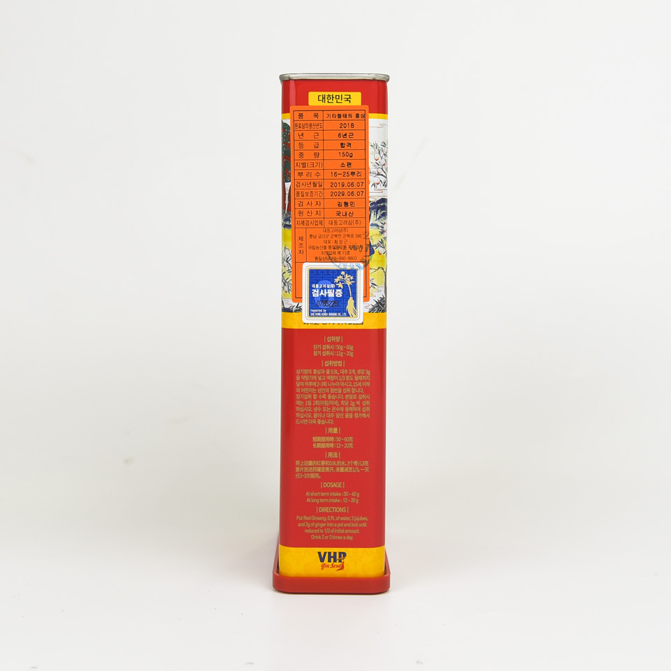 Ở các hộp sâm chuẩn của Daedong (Heaven – Thiên sâm; Earth – Địa sâm, Good – Sâm Good) số củ được ghi bên cạnh hộp và là số duy nhất, ở đây hộp Hồng sâm củ khô Daedong 150gr là hàng độc quyền có từ 16-25 củ (dòng củ nhỏ). Bên dưới có ghi thời gian sản xuất và thời gian hết hạn. Đặc biệt, hồng sâm củ khô được đóng hộp sắt sang trọng, bạn có thể yên tâm vì thời gian của dòng sâm củ khô khá dài thường trên 10 năm với điều kiện tiêu chuẩn nhiệt độ phòng khô thoáng không có ánh nắng trực tiếp mặt trời.