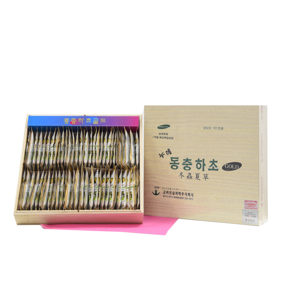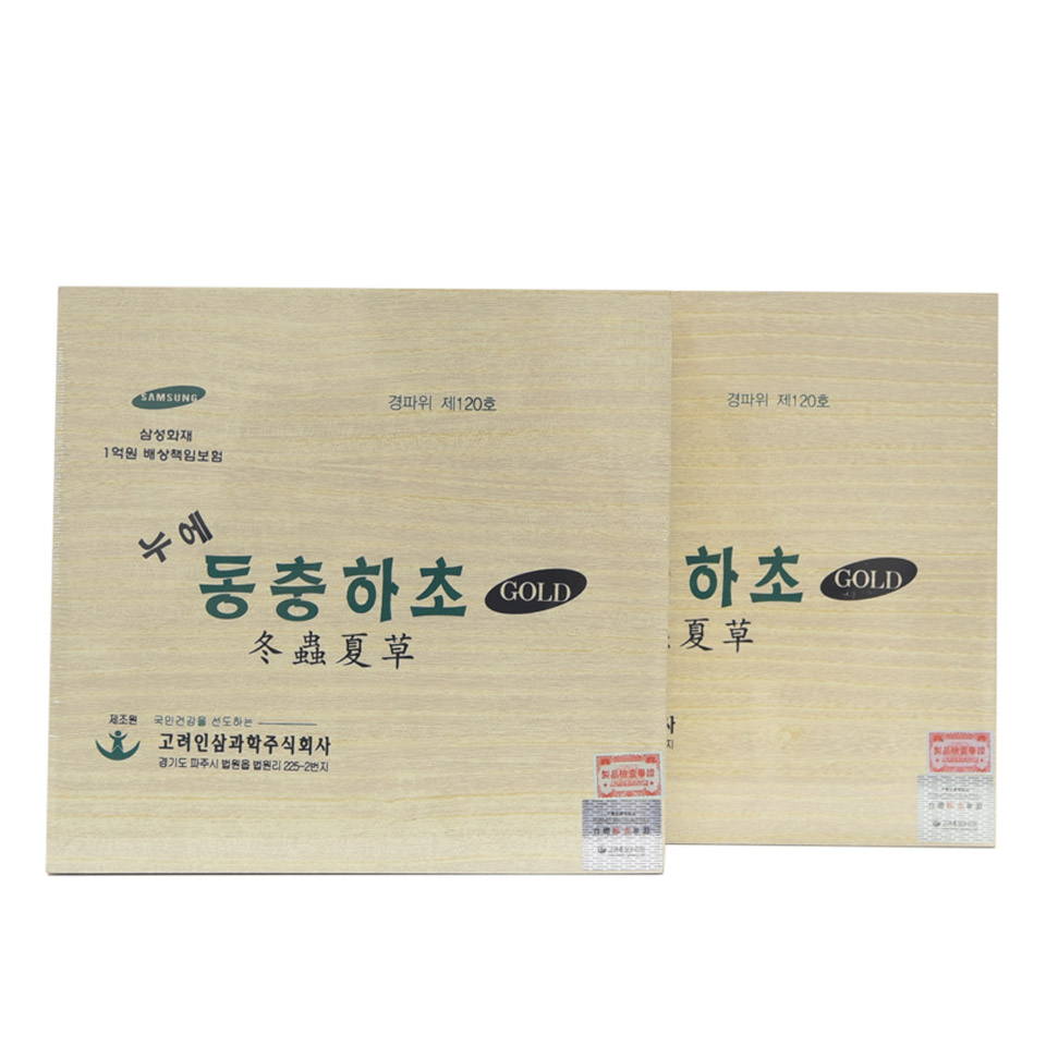 Quy cách: Hộp gỗ thông trắng, bên trong có 60 gói nhỏ x 30ml (1800ml) đông trùng dạng nước silkworm Dongchoonghacho Gold